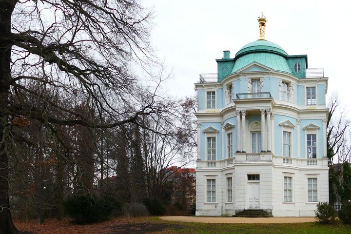 Belvedere Das Belvedere - Teehaus mit Aussichtsturm - ist der älteste Bau im Park, 1788 von Karl Gotthard Langhans erbaut. Im Barockgarten lag das Belvedere auf einer Insel, nach Verlegung der Wasserläufe steht es im Landschaftsgarten nahe der Spree. Die in den Fensterrahmungen des zweiten Stockwerks paarweise eingefügten Hermen (stützende Büsten auf einem Sockel) sind nicht voll ausgebildet, sie wurden erkennbar nachgestaltet.