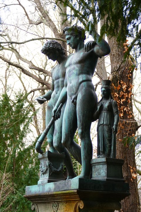 Castor und Pollux Von Bäumen und Sträuchern geschützt steht zwischen Belvedere und Karpfenteich ein Figurenpaar. Die beiden nackten Jünglinge - einer legt den Arm auf die Schulter des anderen - könnte man wegen ihrer Ausstrahlung für ein queeres Paar halten. Tatsächlich werden aber auf dieser antiken Statue eineiige Zwillinge dargestellt, die verschiedene Väter haben - eine Konstellation, die auf die überbordende Phantasie der griechischen Mythologie zurückgeht, aber biologisch immerhin möglich ist - beim Göttervater Zeus war alles vorstellbar.