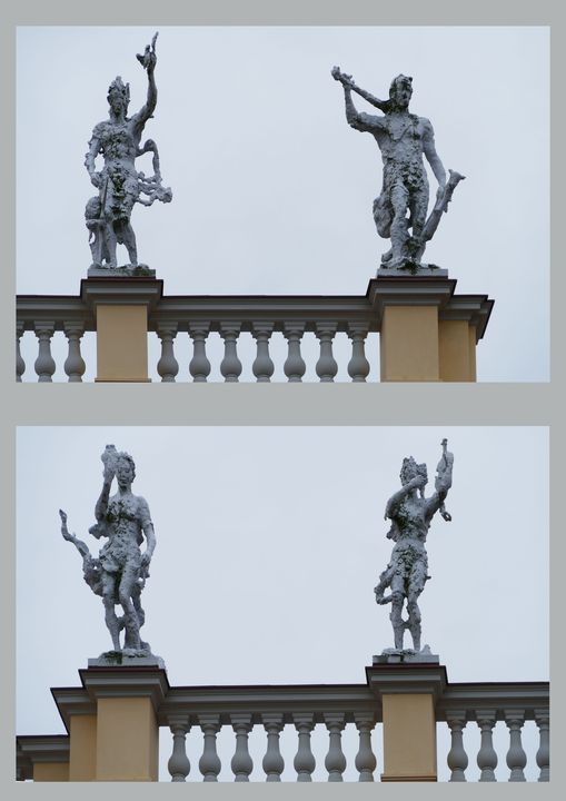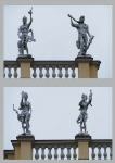 Mit ihren Verrenkungen passen sie so gar nicht zum Charakter des Schlosses und des Parks. Andererseits sind sie dort oben auf der Attika weit genug weg und können den Gesamteindruck nicht wesentlich beeinflussen.