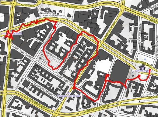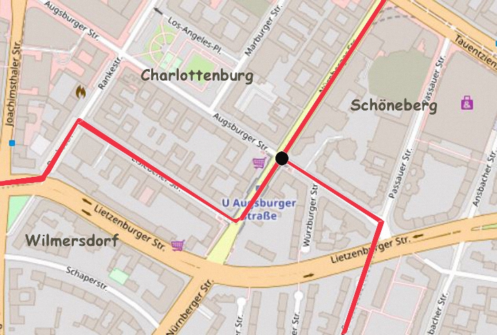 Drei-Bezirke-Eck Drei Bezirke stoßen an der Nürnberger Ecke Augsburger Straße im "Neuen Westen" aneinander - Charlottenburg, Schöneberg und Wilmersdorf - ein Drei-Bezirke-Eck an einer Straßenkreuzung. Zweimal springt die Bezirksgrenze anschließend an beiden Enden der Eislebener Straße hin und her, um sich dann in einem gemächlichen Bogen der Lietzenburger Straße anzuschmiegen, nicht ohne deren Mittelstreifen diagonal überquert zu haben. Dieser Grenzverlauf an der Lietzenburger ist auch ein Erbe der "Südtangente".