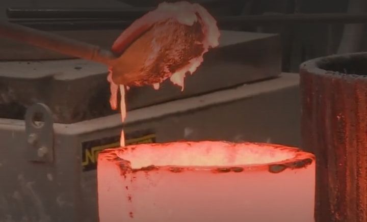 Bronze-Barren Bronze ist eine Legierung aus Kupfer mit Zusatzstoffen, meist Zinn oder Zink. Noack verwendet Siliziumbronze, sie ist mechanisch und chemisch hoch beanspruchbar. Die Bronze wird in 9,5 kg schweren Barren angeliefert. Bei mehr als 1.000 ° C werden die Barren geschmolzen. Die Bronzemenge darf beim Guss nicht zu gering bemessen werden. Ein unvollständiger Guss kann nicht ergänzt werden, sondern muss komplett eingeschmolzen und neu gegossen werden. Nach einem Guss muss die Bronze abkühlen und aushärten. Danach wird die Gießform entfernt und das gegossene Objekt freigelegt.