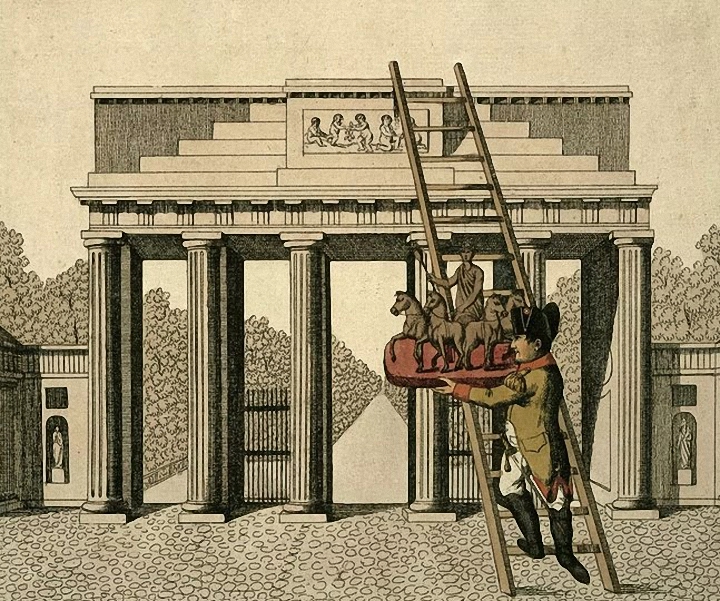 Entstanden kurz nach der Französischen Revolution von 1789, wurde die Figurengruppe schon siebzehn Jahre später ein Opfer der Besetzung Berlins durch Napoleon. Dieser "Pferdedieb" ließ sie 1806 nach Paris bringen. Als die Preußen Napoleon besiegt hatten, holten sie die Quadriga weitere acht Jahre später in einem Triumphzug nach Berlin zurück.