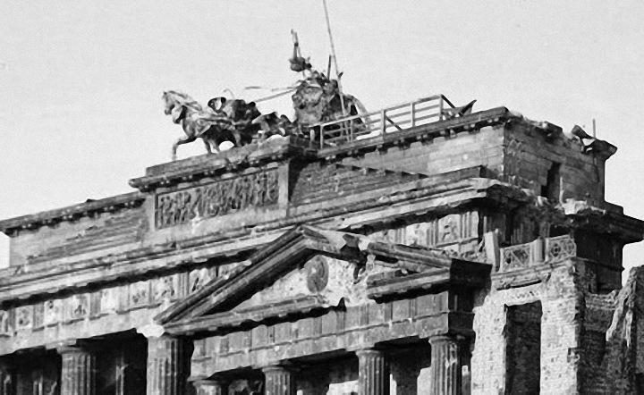 Der Bildhauer Johann Gottfried Schadow hatte die Friedensgöttin und den Triumphwagen mit Pferdegespann 1793 geschaffen. Sie hielt einen Lorbeerkranz, auf dem ein römischer Adler saß. Was mit der Quadriga in den Zeitläuften seitdem geschah, kommt einem kurzen Abriss der europäischen Geschichte nahe.