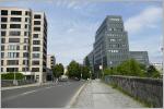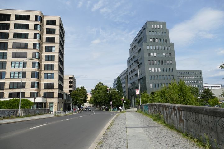 Am Salzufer Ecke Dovestraße stehen sich zwei farblich konträre Nachwendebauten gegenüber. "Spree One" mit gelb-beigen Ziegeln und "Salzufer 22 Berlin" mit abweisenden dunkelgrauen Natursteinplatten. Das Volumen der beiden Bauten scheint ähnlich, aber die Bau-Ideen unterscheiden sich grundsätzlich. Während der graue Klotz nur in mehrere Gebäuderiegel für Büronutzung aufgeteilt ist, hat Spree One eine "städtebauliche Figur, die neue Stadträume entstehen lässt":