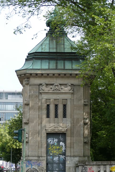 Dovebrücke und Marchbrücke Im Verlauf des Salzufers wurden 1911 vom Charlottenburger Baustadtrat Heinrich Seeling zwei Brücken über den Landwehrkanal erbaut. Beide Brückenwerke ersetzten frühere Holz(klapp)brücken. Die Dovebrücke ist aus Beton gegossen. Die Seitenflächen sind mit rötlichen Klinkern verblendet, der plastische Bauschmuck besteht aus Muschelkalk. Eine Ladestraße am Salzufer sorgte mit elektrischen Ladekränen für den Umschlag zwischen Wasser und Land. An der Brücke angeschlossen waren ein hoher Uhrenturm und ein kleines Bürogebäude für den Ladebetrieb.