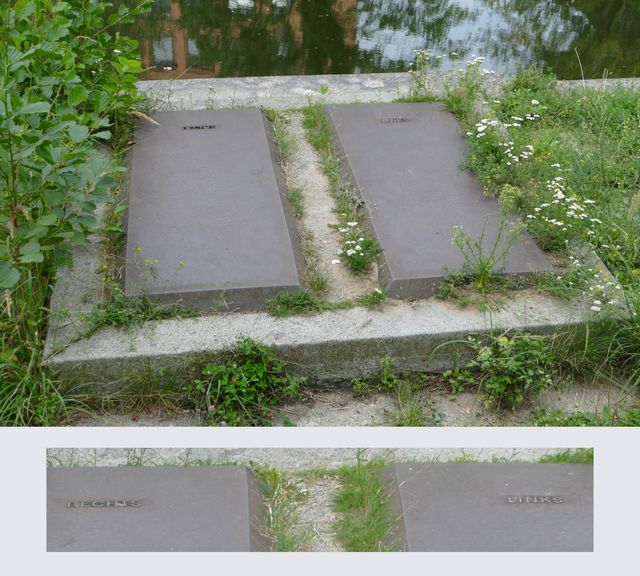 Bodenskulpturen Einsteinufer 17 Zwei Studenten, die am Ufer zwischen niedrigen Metallobjekten eine Auszeit genießen, machen uns aufmerksam auf zwei Metallplatten, die - gemeinsam eingerahmt - genau in der falschen Reihenfolge mit "rechts" und "links" beschriftet sind. Aber wir lassen uns nicht verunsichern, wir wissen wo rechts und links ist. Oder? Lassen wir den Sprachvirtuosen Ernst Jandl mit den Worten spielen: