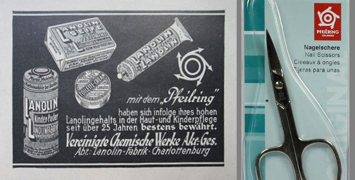 Ein Jahr später hatten die Pfeilringwerke in Solingen (Pinzetten, Gabeln, Messer u.ä.) ebenfalls "Pfeilring" beim Patentamt als Warenzeichen schützen lassen, allerdings als Wort- UND Bildmarke. Erstaunlich: Identische Marken können nebeneinander existieren, wenn sie unterschiedlichen Waren- und Dienstleistungsklassen zugeordnet sind.