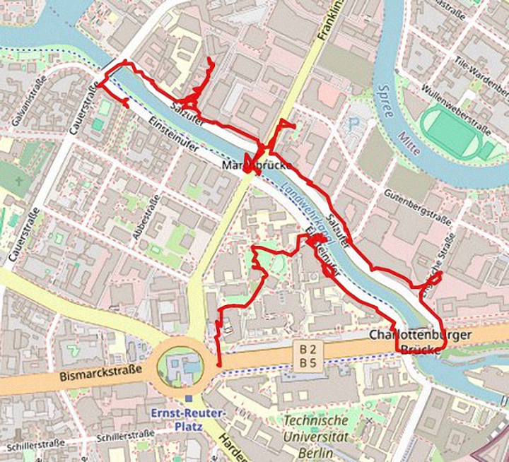 Vom Salzufer an der Dovebrücke bis zum TU-Gelände am Einsteinufer führt unser heutiger Stadtrundgang. Beide Straßen sind einseitig bebaut, der Kanal wird nur von einer grünen Böschung eingefasst. Das Salzufer ist ein Gewerbestandort, drüben am Einsteinufer hat sich die TU nach dem Zweiten Weltkrieg mit ihren Institutsbauten breitgemacht.