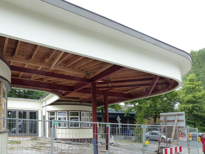 Beide Garagenbauten in Charlottenburg-Wilmersdorf waren zwischenzeitlich dem Verfall preisgegeben und vom Abriss bedroht, werden jetzt aber mit neuer Nutzung herausgeputzt. Für die Kant-Garagen hat sich leider keine autonahe Nutzung gefunden, obwohl diese Idee dem ursprünglichen Zweck am nächsten gewesen wäre. Die Garagen sollen jetzt zu einem "Geschäfts-Kultur-Wohnhybrid" umgewandelt werden. Hoffentlich wird das Ergebnis nicht so geschmacklos wie dieses Wortungetüm. In dem Baudenkmal sollen Gastronomie, eine Kunsthalle, Galerien, Startup-Büros eröffnen und der Architekt will für sich ein Penthouse aufs Dach setzen. Bei der Holtzendorff-Garage ist gerade der Tankstellenkomplex restauriert worden, hier soll ein Café eröffnen und in dem geplanten angrenzenden Wohnhausneubau ein Bio-Supermarkt.
