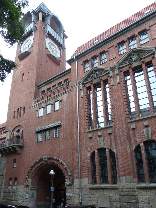 Zwei Schulen Zwei Schulkomplexe sind an der Sybelstraße entstanden. Noch im Kaiserreich wurde 1909 die Gemeinde-Doppelschule auf dem Grundstück 20-21 mit 75 Meter Straßenfront eingeweiht. Eine stattliches Gebäude, hinter dem man kaum eine Schule vermuten würde. Mit einem Uhrenturm, Granitsockel, einer Fassade aus rotem Backstein, Muschelkalk-Gliederungen und Reliefschmuck. Im vorderen Bauteil waren die Klassenräume für die Knaben untergebracht, im hofseitigen schlichteren Flügel die Klassenräume für die Mädchen.