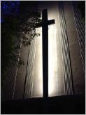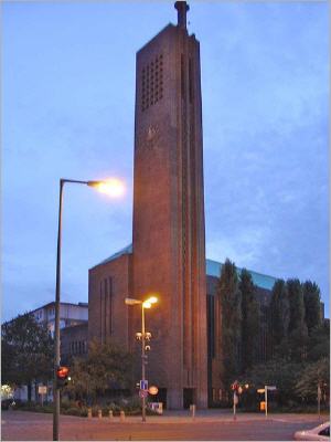 Nur wenn eine Kirche sich selbst ins rechte Licht setzt (wie die Kirche Zum Heiligen Kreuz in der Nassauischen Straße), wird die Dunkelheit zum Verbündeten. Dagegen war am Hohenzollernplatz war im Restlicht des vergehenden Tages nur der endlos in den Himmel strebende Klinkerturm gut auszumachen.