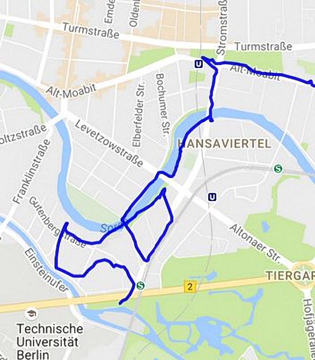 Unser letztes Ziel heute ist die am Rande des Hansaviertels liegende Hansa-Schule, die im Zusammenhang mit der Interbau 1957 (6) vom Senatsbaudirektor Bruno Grimmek entworfen wurde (7). Luftig, sonnig, weiträumig sollte die moderne Schule sein, die vorderen Bauteile wirken wie Pavillons, obwohl sie mehrgeschossig sind und auf schlanken Stützen stehen und damit das Spreeufer einbeziehen.