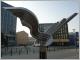 Die "Spreestadt" zwischen Salzufer und Spreebogen geht inzwischen der Vollendung entgegen, um die Königliche Porzellan-Manufaktur (KPM) herum entstand ein "Stadtquartier für Dienstleistung, Gewerbe und Wohnen" (2). Am Herbert-Lewin-Platz gruppieren sich Häuser von Ärzte- und Krankenhausverbänden. Ein 12 Meter langer Messingbrunnen könnte auch für eine lang gestreckte Sitzfläche gehalten werden, wenn kein Wasser fließt. Die "Woge mit gegenläufigen Flügeln" von Volker Haase wird jedoch unmittelbar als Kunstwerk wahrgenommen. Das Thema Woge hat Volker Haase sehr beschäftigt, es gibt eine "Flammende Woge" in Bingen, eine "Kleine Woge" in Baiertal, eine "Kleine Woge auf Kyanit" in Wiesloch und eine "Woge mit Kugel" in unserem Lietzenseepark. Es ist eine tänzerische Schwerelosigkeit in dieser Form, die dem Metall weiche Akzente abgewinnt. Weil wir das Kunstwerk aus immer neuen Blickwinkeln fotografieren, wird aus einem Verbändehaus ein Mitarbeiter zu uns herüber geschickt, der wissen will, ob wir Profifotografen sind. Nicht nur Überwachungskameras beobachten uns bei vielen Schritten, auch Anwohner betrachten uns manchmal mit Argwohn. Schon Franz Hessel hatte beklagt, manchmal wie ein Taschendieb misstrauisch betrachtet worden zu sein.