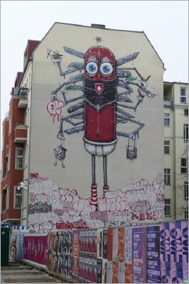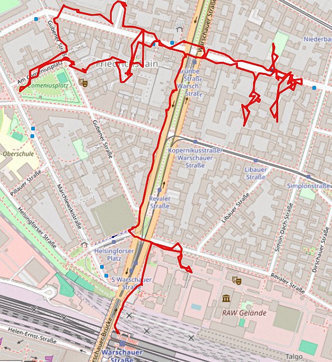 Das Stralauer Viertel (Vorstadt vor dem Stralauer Tor) längs der Warschauer Straße war vor sieben Jahren schon einmal Ziel einer ausgiebigen Spaziererkundung. Heute sind wir entlang der Grünberger Straße unterwegs, die die Warschauer kreuzt. Eigentlich kann uns die Tram M10 direkt vom Naturkundemuseum zur Grünberger Straße bringen, aber wir müssen auf U-Bahn und S-Bahn ausweichen. Von den öffentlichen Verkehrsmitteln ist im Moment immer mindestens eins verspätet oder unterbrochen, Stellwerksstörung, Schäden an einem Zug oder Fahrzeug, Krankheit von Busfahrern und Zugführern, Polizeieinsatz, Notarzteinsatz, Kabeldiebstahl und andere Widrigkeiten bringen den Fahrplan zu häufig zum Fall.