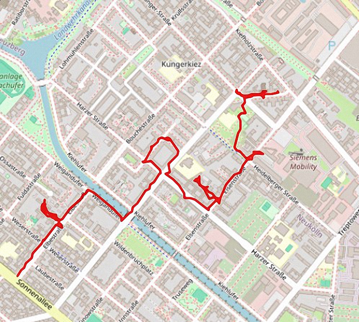 Neukölln und Treptow Im Zickzack überschreiten viele Straßen in diesem Viertel die ehemalige Sektorengrenze zwischen Neukölln und Treptow, beispielsweise Bouchéstraße, Elsenstraße, Wildenbruchstraße, Harzer oder Heidelberger Straße. Diese skurrilen Grenzverläufe innerhalb des Viertels sind heute kaum mehr sichtbar. An der Heidelberger Straße ist ein Teil des Grenzstreifens und Postenweges der Grenzer und eine wilde Grünfläche erhalten geblieben. Andere Lücken wurden durch Neubauten geschlossen.