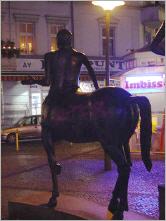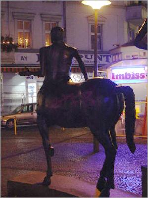 Kentauren (Zentauren) sind wilder Fabelwesen der griechischen Sage mit menschlichem Oberkörper und Pferdeleib, sagt das Lexikon (und sagt Petra, die etwas von Pferden und von Menschen versteht). Und solche wilden Fabelwesen stehen mitten in Neukölln herum (1), auf Plätzen, die Imbisse beherbergen und blaue achteckige Pavillons, die - wären sie grün - wie die historischen Berliner Pisshäuschen aussähen.