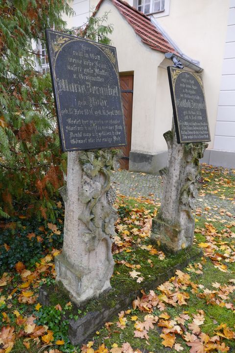 Kirchhof und Gemeindefriedhof Die Dorfkirche ist von einem Kirchhof umgeben, auf dem mehrere ungewöhnliche Grabsteine zu finden sind: Aufrecht stehende Stelen, im oberen Bereich mit einer schräg angebrachten Inschrifttafel, die den Text ins Blickfeld bringt, ohne dass man sich herunterbeugen muss. Solche "Pultsteine" (ähnlich einem Stehpult) haben eine lange Historie, wir haben sie aber noch nie gesehen auf Berliner Friedhöfen.