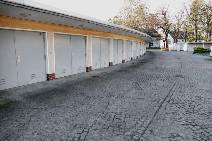 Als denkmalwürdig wurde in dieser Siedlung eine Garagenanlage eingestuft, die als Nachkriegsmoderne bemerkenswert ist. In einem geschwungenen Baukörper sind die Garagen angeordnet. Darüber schwebt ein vorkragendes Pultdach. Deckenleuchten mit Milchglasschalen beleuchten die zweiflügeligen Garagentore. Ein Architekt aus der Berliner Bauverwaltung hat diesen markanten Bau entworfen, der so viel Leichtigkeit ausstrahlt.