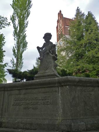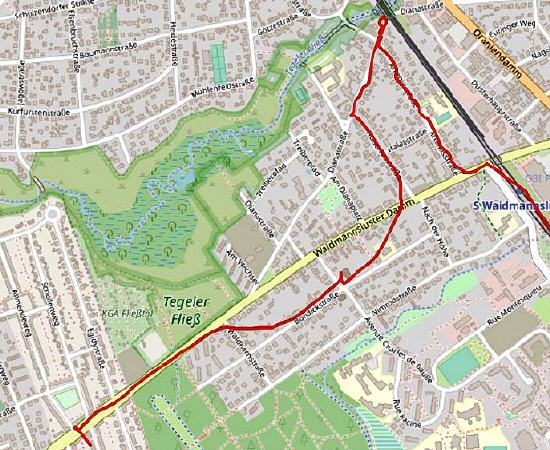 Unser Weg führte uns zunächst vom S-Bahnhof Waidmannslust durch die nördlich des Waidmannsluster Damms gelegene "Jägersiedlung" mit Straßennamen wie Hubertus, Halali und Diana. Hier befindet sich in der Artemisstraße das "schönste Schulgebäude des Berliner Nordens", ein imposanter Backsteinbau mit Segmentbogen-Zwillingsfenstern und einem Stufengiebel, auf dem kleine Türmchen (Fialen) thronen. Neben der Schule drückt sich ein scheues Reh ins wuchernde Grün. Eingerahmt wird die Siedlung durch das Tegeler Fließ, an das sich im Süden der Steinberg-Park und Steinberg-See anschließen (1). Zwischen dem S-Bahnhof und dem Park liegt die in der französischen Besatzungszeit Berlins errichtete Cité Foch (2). Die Trikolore des Stadtkommandanten wehte früher auf dem terrassenartig angelegten Villengrundstück Bondickstraße 1, das vorher einem Bankdirektor und danach einem Schokoladenfabrikanten gehört hatte.