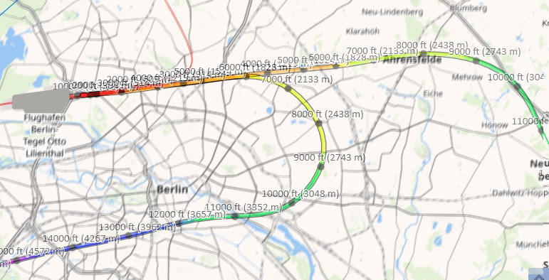 Heute sind in der einen Stunde zwischen halb vier und halb fünf nur zwei Flugzeuge in Tegel gestartet, die Ziele waren Köln/Bonn und München. Landungen gab es in dieser Stunde keine. Die Deutsche Flugsicherung veröffentlicht seit langem freigiebig die Flugspuren im Internet. Beide Abflüge starteten nach Osten. Die Maschine nach Köln-Bonn flog noch über dem Stadtgebiet über Lichtenberg und Kreuzberg eine Kurve Richtung Westen. Die Münchener Maschine begann erst in Ahrensfelde, sich nach Süden zu wenden.