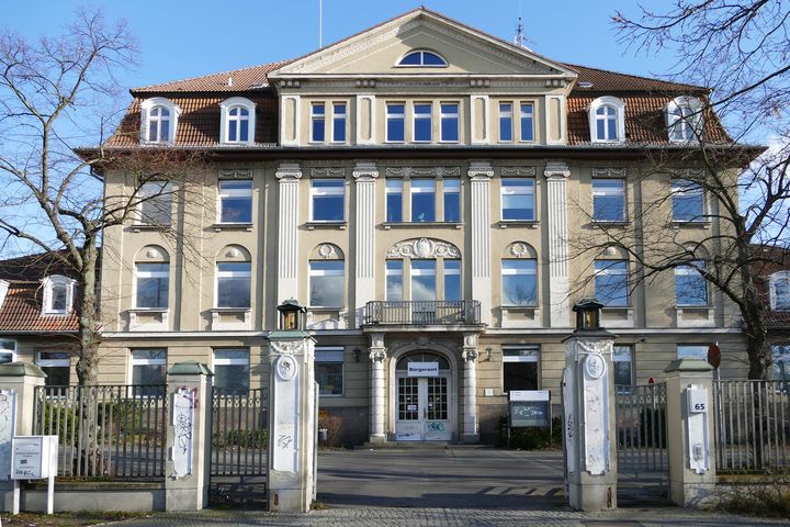 In der Teichstraße steht man vor einem mächtigen, klassizistisch geprägten Bau mit Tympanon (Dreiecksgiebel) und Pilastern (Wandpfeilern), die sich in einer Kolossalordnung über mehrere Etagen erstrecken. Das Schild "Bürgeramt" über der Tür widerspricht dem Äskulap-Medaillon am Eingang, das auf die Heilkunst verweist. Das 1908 als Teil eines modernen Krankenhauskomplexes erbaute Gebäude wird von der Bezirksverwaltung genutzt, seitdem 1985 am Nordgraben ein neues Humboldt-Krankenhaus entstanden war.