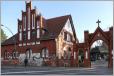 Zwei historische Bauten in diesem Teil der Ollenhauerstraße wollen wir zum Abschluss betrachten. Ein gelber Backsteinbau auf dem Grundstück Nr.99 ist mit zwei unterschiedlichen Giebeln und einem Treppenhausturm asymmetrisch gegliedert. Hier hatte 1890 ein Messingwerk einen Standort der metallverarbeitenden Industrie begründet. Durch die Kremmener Bahn von Wittenau nach Tegel und die Industriebahn Tegel-Friedrichsfelde dehnte sich die Industrie von hier weiter nach Norden aus.