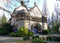 Bei der Randwanderung der Friedhöfe ist die erste Erweiterung von St. Hedwig in Weißensee angekommen und die nächste hier in Reinickendorf. Eine Vielzahl eindrucksvoller Grabmale wie in der Liesenstraße findet man hier nicht. Aber eine ungewöhnliche wuchtige Friedhofskapelle, mit der ein Kölner Kirchenbaumeister den Berlinern vorführte, wie rheinischer Kirchen der Romanik aussahen. Besonders monumental wirkt der Kirchenbau, weil er wie eine Festung auf erhöhtem Bauplatz angelegt wurde.
