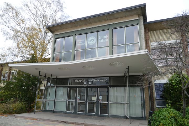 Ein weit auskragendes Vordach vor der Sprossenfenster-Fassade weist die Schule in der Ziekestraße als Bau der Nachkriegsmoderne aus. Das Gebäude mit drei Flügeln - 1958 erbaut - erstreckt sich weit in die Seitenstraße hinein und umschließt einen großen Schulhof. Die von der Schule angebotenen Arbeitsgemeinschaften umfassen ein vielfältiges Angebot: Schach, Kunstwerkstatt, Theater und Musical, Zirkus und Akrobatik. Die Schule will "Freude am Lernen“ vermitteln.
