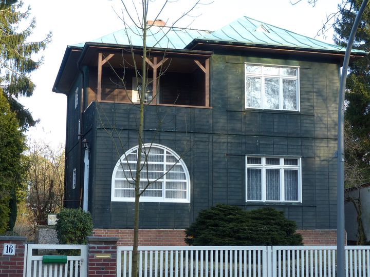Villen und Landhäuser beherrschen das Bild von Frohnau, es gibt aber auch mehrere Siedlungen innerhalb der Gartenstadt. Auf unserem Weg liegen die Siedlung Frohnau am Maximiliankorso und die Siedlung Barbarossahöhe des Architekten Paul Poser an der Welfenallee. Poser arbeitete für die Terraingesellschaft, viele Villen am Ort hat er entworfen. Der Platz vor der Siedlung Barbarossahöhe wurde nach ihm benannt, sein Grab befindet sich auf dem Friedhof Frohnau, es ist erstaunlicherweise kein Ehrengrab der Stadt Berlin.