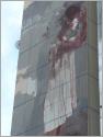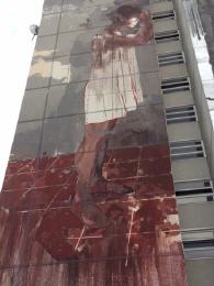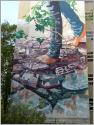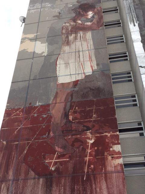 Das Wandgemälde zeigt ein Mädchen, das die Hände ans Gesicht gelegt hat. Der Boden, auf dem das Mädchen steht, ist rot gefärbt, das Kleid hat rote Spuren. Die zweite Hälfte des Murals zeigt einen Wald, in dem ein Mensch, von mehreren Pfeilen getroffen, an einem Baum steht. Manche sehen das Mädchen "in einer Blutlache stehen". Tropft Blut in dünnen Rinnsalen an seinem Körper herunter? Oder hat der Künstler den Faltenwurf des Kleids nur mit rötlichen Strichen betont und die angebliche Blutlache ist nur ein farbiger Fußboden?