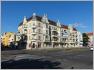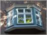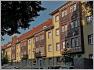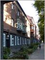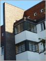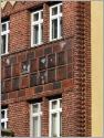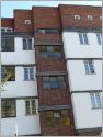 Drei Wohnanlagen in Reinockendorf-West zwischen Auguste-Viktoria-Allee und Scharnweberstraße mit rund 800 Wohnungen sind in den 1920er Jahren als erste große Wohnprojekte Reinickendorfs von Baugenossenschaften errichtet worden (5a). Ein kleiner öffentlicher Grünstreifen durchbricht die Bebauung, die eine erstaunliche Vielfalt von Fassadendetails je nach Bauteil aufweist. Giebel oder Traufe zur Straße, Klappläden, Erker mit Holzverkleidung, Balkons mit Korbgittern. Außergewöhnlich sind in der General-Woyna-Straße die Flacherker mit ihrem Dekor. Flacherker ist ein plastischer Begriff, den ich bisher nicht kannte. Er bezeichnet einen Fensterbereich, der reliefartig aus der Fassade hervortritt, ohne eine Wohnfunktion zu haben, also eine reine Gebäudedekoration. Ein mehrzeiliger Fries von Terrakotta-Elementen trennt die zwei oder drei Etagen gegeneinander ab, über die sich der Flacherker erstreckt (Architekt: Hans Kraffert).