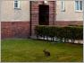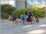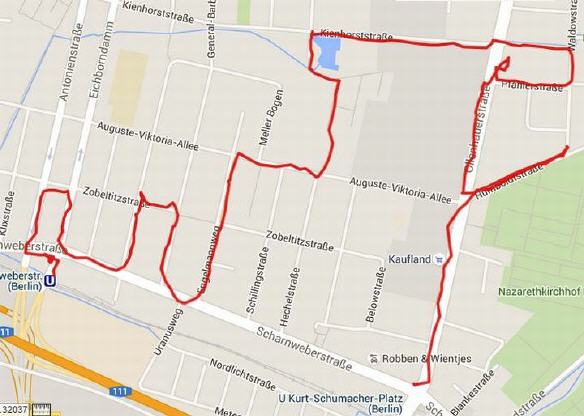 Was macht ein Schlittenhunde-Fahrer, wenn kein Schnee liegt? Er steigt um auf ein Hundegespann mit Rädern. Früher war das ein Verkehrsmittel der Armen, die sich kein Ochsen- oder Pferdegespann leisten konnten. Heute werden Hundewagen unterschiedlicher Kategorien bei Wagenrennen und Geschicklichkeitsparcours eingesetzt. Das Hundegefährt, dem wir in der Auguste-Viktoria-Allee begegnet sind, wurde von einem Schäferhund gezogen, der in einen Zugbügel eingespannt war. Vielleicht sollte der an einer Leine mitgeführte zweite Hund als Reservehund dienen, wenn der erste müde war? Eine Box hinten auf dem Gefährt hätte jedenfalls dem erschöpftes Zugtier Platz geboten. Oder wurde der zweite Hund als Rückwärtsgang gebraucht? Ein ganz anderes Hundesgespann habe ich aus dem Central Park in New York in Erinnerung. Dort sah ich einen an der Hinterpfote verletzten Hund, der zur Entlastung die Hinterbeine in einem Gestell mit Rädern hinter sich her fuhr. Hundebuggys, die wie ein Kinderwagen von Herrchen oder Frauchen geschoben wurden, kenne ich ebenfalls aus dem Pet-vernarrten New York, man kann sie aber auch bei uns kaufen.