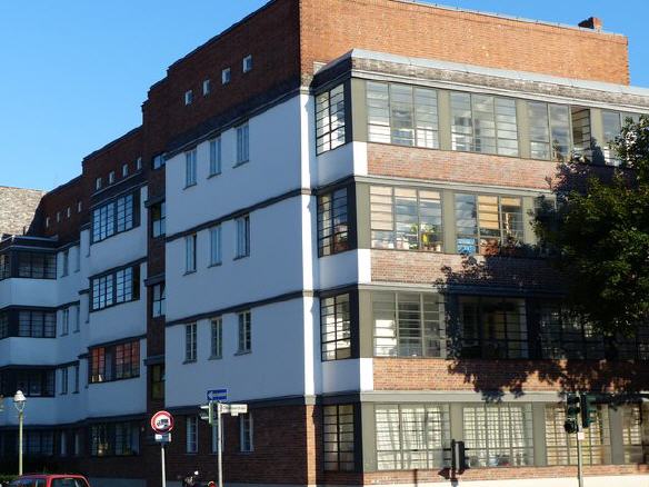 Spannend ist das Flanieren immer, aber heute sind wir regelrecht begeistert angesichts der Wohnbauten von Erwin Gutkind (2), die ein Karree an der Ollenhauerstraße umfassen. An der Front zur Ollenhauerstraße reichen zwei Gebäudeflügel bis an die Baufluchtlinie heran, der Mittelteil ist um 40 Meter zurückgesetzt. Dadurch entsteht eine Freifläche, die mehr ist als ein großzügiger Vorgarten. Vor den beiden Flügeln machen verglaste Wintergärten die Fassade transparent. Flächen in weiß, anthrazit und Ziegelmauerwerk und die Stahleinfassungen der Fenster bringen klare Struktur und zugleich Lebendigkeit ins Bild. Die weißen Fassadenflächen ziehen sich für die Wohnungen in den oberen Geschossen um den gesamten Block herum, durch waagerechte Gurtgesimse etagenweise getrennt. Das Dachgeschoss mit den kleinen Lichtöffnungen und das Erdgeschoss - beide als Ziegelmauerwerk sichtbar - umrahmen die weißen Wohnetagen. In den Seitenstraßen machen Vor- und Rücksprünge und Vorgärten die lange Fassade lebendig. Die konkav eingezogenen Häuserecken stellen die gestalterische Verbindung zu einem anderen Bauprojekt Gutkinds her, dem Sonnenhof in Lichtenberg (3), bei dem zusätzlich Balkons aus den eingezogenen Ecken hervorspringen.