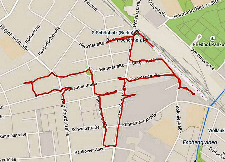 Dem Quartier links und rechts der Reinickendorfer Provinzstraße ist unser heutiger Rundgang gewidmet. Es ist kein Kiez mit eigener Identität, und dann fehlt dem Quartier auch noch ein übergreifender gemeinsamer Name. Auch die Straßenbenennungen haben keinen inneren Zusammenhang. So sind Straßen nach Jahreszeiten benannt, aber nur Sommer, Herbst und Winter findet man hier, der Frühling liegt in Pankow jenseits der Bahntrasse. Viele Straßen führen den Namen von früheren Grundbesitzern (Amende, Hoppe, Ebenstein, auch Hausotter ist der Name eines Grundstückseigentümers). Völlig aus dem Rahmen fällt die Granatenstraße, die schon seit 150 Jahren so heißt. Sie verweist auf die historische Nutzung als Schießplatz.