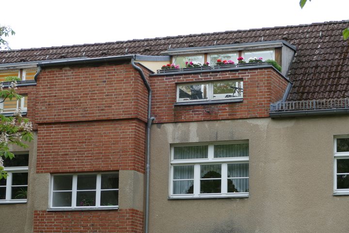 Die Dachgeschosse selbst sind mit Terrassen zur Straßenseite ausgebaut. Ungewöhnlich sind die Fenster, die in die Terrassenbrüstungen eingelassen sind. Sie erlauben von außen den Einblick vom Terrassenboden bis zur Tischhöhe. Wer will das schon als Bewohner? Ihre Funktion erschließt sich nicht, ganz überwiegend sind diese Fenster mit Folien blickdicht verkleidet.