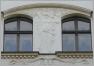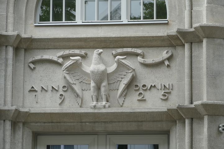 Über der Portalanlage, die aus einem Stück in Beton gegossen ist, breitet unter dem Spruchband "Deutsche Reichspost" der Reichsadler seine Flügel aus. Aber was ist das, er schaut zur falschen Seite! Von sich aus gesehen nach links, dabei schauen Reichsadler sonst immer nach rechts, auch der Adler der "Königlich Preußischen Posthalterei" von 1776. Und das ist kein Zufall, sondern preußisch korrekt so geregelt, Adler haben nach rechts zu blicken.