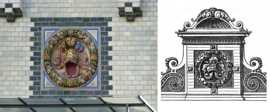 Die figürlichen Terrakotten schuf der Bildhauer Otto Lessing. Über die Bedeutung der darin enthaltenen Symbole schreibt das Centralblatt: "Die Medaillons stellen sinnbildlich Wein, Bier, Thee, Kaffee und Tabak dar, theils durch Figuren allgemein bekannter Ueberlieferung, wie Bacchus und Gambrinus, theils durch Bevölkerungs-Typen der verschiedenen Länder, welchen diese Genußmittel entstammen". Keine Spur von Freimaurern und ihren Zeichen.