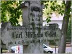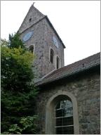 Nördlich des Teichs steht die Dorfkirche, die ihren markanten eckigen Turm erst nach 1900 erhalten haben soll (langsam gewöhne ich mich daran, wegen der Missverständlichkeit im angebrochenen Jahr 2000 nicht mehr von der "Jahrhundertwende" zu sprechen). Die Kirche ist von dem alten Kirchhof umgeben. Hier liegt der "Bauernhofbesitzer" neben der zu früh dahingegangenen "Jungfrau", die Beerdigungen erfolgten meist bis kurz nach 1900, nur seltenen Fällen auch erheblich später.