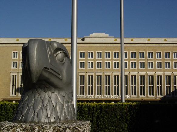 Vor dem Flughafen Tempelhof steht nicht nur das Denkmal zur Erinnerung an die Luftbrücke ("Hungerharke"), sondern auch ein überdimensionaler Adlerkopf. Von dem Flughafenarchitekten Sagebiel entworfen, stand ein kompletter Adler mit diesem Kopf seit 1940 auf dem Dach der Haupthalle. Als die Amerikaner dort 1962 eine Radaranlage aufbauten, wurde der Adler zerlegt und bis auf den Kopf entsorgt, der Körper war marode. Der Kopf wurde wie andere Siegestrophäen aus „Nazi Germany“ in die USA geschickt ins Museum der Militärakademie West Point. Dort landete er im Magazin, wurde nicht ausgestellt und vergessen.