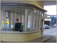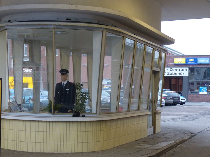 Die Fabrikbauten von Schlüterbrot/Bärenbrot hat der Industriearchitekt Bruno Buch geschaffen und auch die Gebäude der Opel-Werke, die heute in unseren Blick kommen. Eine Halle mit mächtigem Turmgebäude, hier wurden seit 1919 Kraftfahrzeuge repariert. Davor die großflächige Glasfront des Verkaufspavillons, der erst 1960 gebaut wurde. Im gläsernen Pförtnerhäuschen steht heute ein Pappkamerad stramm, freundlich schauend, aber unbeweglich.