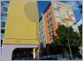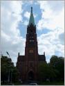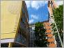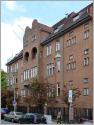 Den Kleistpark umrunden wir heute, ohne hereinzugehen. Er war schon im September 2005 unser Ziel (2). Auch mit der Geschichte des Sportpalasts, nach dessen Abriss eine Wohnmaschine ("Sozialpalast") errichtet wurde, haben wir uns bereits beschäftigt (4). In diesen Bauriegel quer über die Pallasstraße wurde ein Hochbunker integriert, auch hierüber hatte ich bereits geschrieben (5). So schließt sich für uns heute der Kreis an der Pallasstraße mit der Kirche und den Gründerzeitbauten, darunter zwei Bauten von Bruno Möhring (6). Eine Schule an der Goltzstraße mit knalligem gelb und orange und einer ungewöhnlichen Bauform wirkt wie frühe Postmoderne (7), ist aber bereits Ende der 1950er Jahre entstanden. Der Verein für die Geschichte Berlins meint hierzu: "Ernst ist das Leben, heiter ist die Kunst."