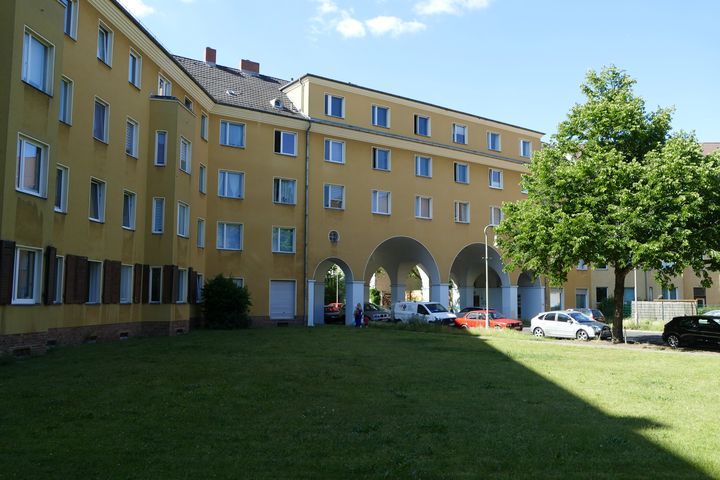 Nördlich der Gartenstadt errichtete der Bezirksstadtbaurat Fritz Bräuning zehn Jahre nach der Gartenstadt Anfang der 1930er Jahre eine fünfgeschossige Wohnanlage im Format des städtischen Geschoßwohnungsbaus. Das besondere war die U-förmige Öffnung nach Norden, wodurch die Wohnungen besser belüftet werden konnten. Am Blockrand im Süden erstrecken sich die Balkonachsen über die gesamte Gebäudehöhe, wodurch die Fassade rhythmisch gegliedert wird.