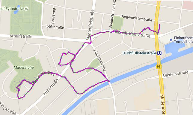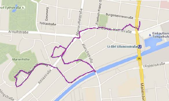 Inzwischen ist die Abenddämmerung hereingebrochen, und so streben wir zu einem Italiener am Fuß der Marienhöhe, um uns zu stärken. Aufmerksam und zügig bedient finden wir den Weg zurück zum U-Bahnhof Ullsteinstraße.
