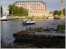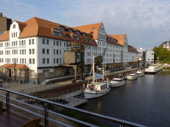 "Berlins einziges Einkaufszentrum, in das man auch mit dem Schiff kommen kann": Dieser Spruch wirkt im Herbst 2009 etwas sehr vollmundig, denn die Hafenseite des Einkaufzentrums ist unbelebt und schläfrig. Unter den markanten Kränen, die auf Gleisen entlang fahren könnten, wenn sie noch in Betrieb wären, sind Andeutungen einer gastronomischen Nutzung der Wasserseite zu erkennen. Viele Schiffe ankern hier nicht, aber Bagger stehen zwischen Sandbergen und lagernden Baustoffen. Shopping spielt sich auf der Straßenseite ab, von dort wird das alte Lagergebäude von einem modernen Einkaufscenter umklammert. Ob das Lagergebäude im Innern mit in das Center einbezogen wurde, können wir nicht sehen.