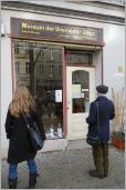 Im "Museum der unerhörten Dinge" kann man das Geheimnis der Kuhfladen ergründen, Träume abgeben, einen Schlitzohrchirurgen kennen lernen oder den Einschlag eines Gedankenblitzes beobachten. Wir bleiben vor dem Schaufenster stehen, in dem mehrere identische Aufsteller mit dem Konterfei des Namensgebers der Straße, August Leopold Crelle, nebeneinander stehen. Das ist sicherlich symbolisch zu verstehen, denn August Crelle war ein Multitalent, brachte es in mehreren Berufen zu außergewöhnlichen Leistungen. Er war ein Autodidakt, hatte sich alle Fähigkeiten im Selbststudium angeeignet.