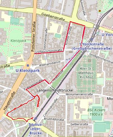 Die Großgörschenstraße führt von dort als Fußweg unter der S-Bahnbrücke hindurch. Hinter der Brücke liegt der Alte St. Matthäusfriedhof, dem wir vor elf Jahren einen Besuch abgestattet haben, bis wir abendlich hinauskomplimentiert wurden.