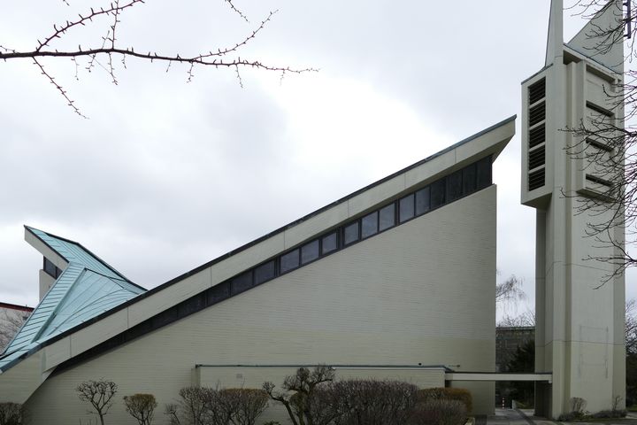 Ungewöhnlich ist auch die bildhafte Gestalt der 1969 erbauten Kirche, die man als Zelt des wandernden Gottesvolkes sehen kann oder als Schiff mit hochgezogenem Bug und dem Glockenturm als Mast. Das schwingende Betondach - eine gewagte Konstruktion - wirkt sehr leicht, es hat die Form eines "hyperbolischen Paraboloids", hier verbinden sich Parabel und Hyperbel zu einem dreidimensionalen Gebilde.