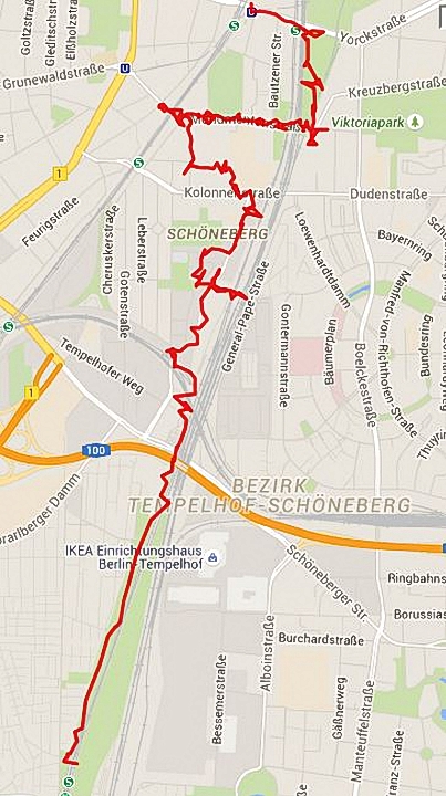 Das Autobahn-Thema hat sich eingeschlichen in unseren Spaziergang, der eigentlich einer Welt zwischen den Schienen gewidmet ist, dem Gelände zwischen Dresdener Bahn und Wannseebahn in Schöneberg. Gemeinsam vom Potsdamer Platz kommend, streben die Bahnlinien auf der Höhe Bülowstraße nach Süden auseinander. Die Monumentenstraße führt bereits mit zwei verschiedenen Brücken über die Gleise, an den S-Bahnhöfen Schöneberg und Südkreuz liegt dann schon mehr als ein Kilometer Ringbahn zwischen ihnen.