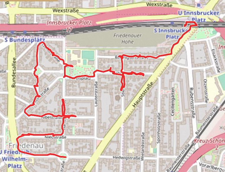 Vom Innsbrucker Platz strebt die Hauptstraße dem Walther-Schreiber Platz entgegen, vom Bundesplatz kommt im spitzen Winkel die Bundesallee hinzu. Diese drei Plätze umfassen den Teil Friedenaus, in dem wir heute unterwegs sind. Ich nenne ihn "Friedenauer Dreieck", obwohl hier kein Mangel einer Figur im Stadtgrundriss ist, gibt es doch schon die "Carstenn-Figur".