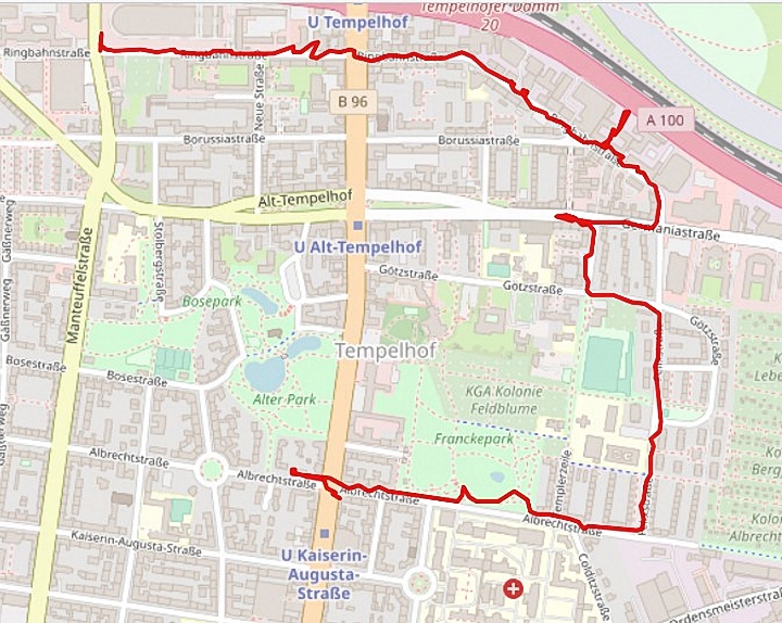 > An der Ecke Manteuffelstraße haben wir unseren Rundgang durch die Ringbahnstraße beendet. Westlich davon liegt das Reichspostzentralamt, zu dem sie dieser Spaziergang Richtung Alboinplatz führt: Drei Eiszeiten - eine Stadt